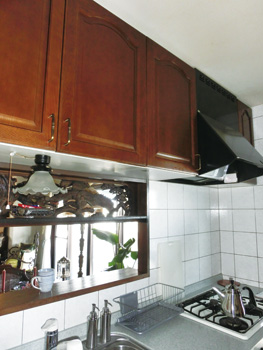 | 既存のキッチンをダークブラウンに塗装し、部屋のトーンと合わせた。質感のよさが醸し出されている | 窓ガラスはサイズを調整し、ステンドガラスを取り付けた。レンガ調のタイルもポイント |
