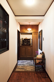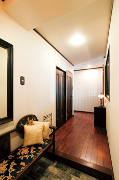 | 玄関のたたきは石畳調で重厚感のあるタイルを採用 | エントランスから続くフローリングはご主人がこだわって選んだ |
