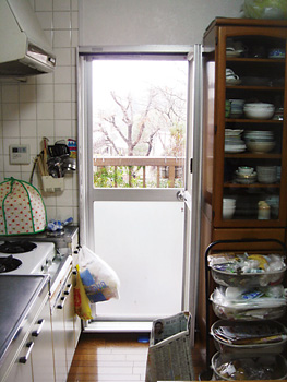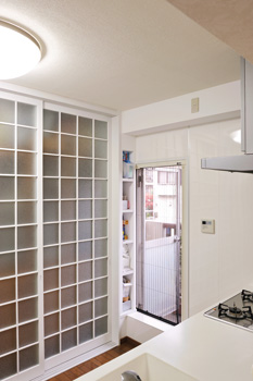 問題の給排水管や換気ダクトはキッチンの機能や景観を損なうことなくスッキリと配され、背面収納棚もスタイリッシュで機能性に富んだものに。勝手口も以前より出入りしやすくなった。試行錯誤を繰り返しながら、妥協することなく自身の思いを貫いたKさん。その信念が実を結び、限られたスペースを最大限に生かした、動きやすさとゆとりを併せ持つ「主婦の城」に様変わりした。