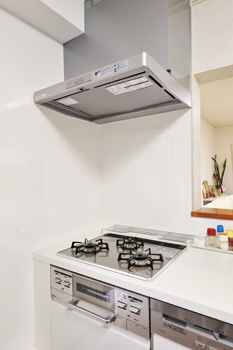 | 掃除がしやすいガラストップのガスコンロとフィルターのないレンジフード | 上部に換気ダクトの管、下部に排水管を配管 |