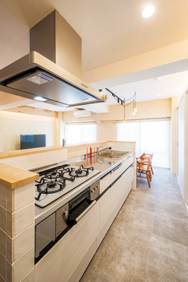 壁側のほぼ全面をキッチン収納にしたことで食器などの収納力が大幅に向上。ガスコンロは新しいシステムキッチンに取り付けて再利用。リビング側に油が飛び散らないよう、レンジフードの下にガラスを取り付けた。床の高さが7センチ上がったことで窓の外の景色が以前よりよく見えるようになったとか。