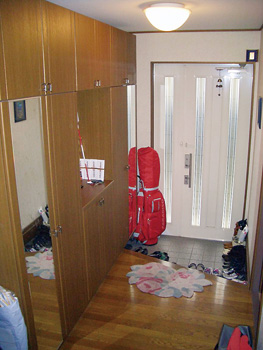 | 壁クロスを白に貼り替え、床は無垢のパイン材で明るさを増した玄関。左側の収納棚は、白い空間になじむよう、既存のものに白い化粧シートを貼って活用。右側は便利なウォークインクローゼットに直結。 |