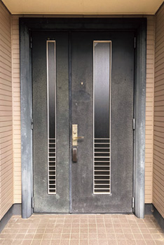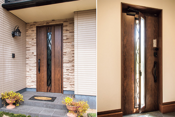 外壁と同系色のタイルをあしらった玄関。アクセント壁とドアのデザインに合わせ、照明も新設。通風と採光に優れ,中央の網戸が斜めに開くため屋内はほぼ見えない。