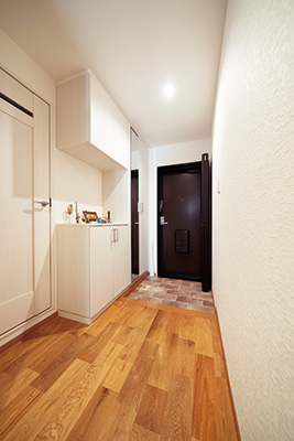 収納を新設した玄関。天井までの高さがある大きな姿見も設置し、土間部分にはレンガ調のフロアタイルを敷いた。