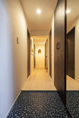 玄関の床は落ち着きのあるフロアタイル。廊下はシンプルなクロスでまとめ、室内へ入ったときとのギャップを体感させる 。