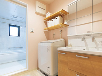 手洗いとペーパーホルダーを片面にまとめることで空間をすっきり