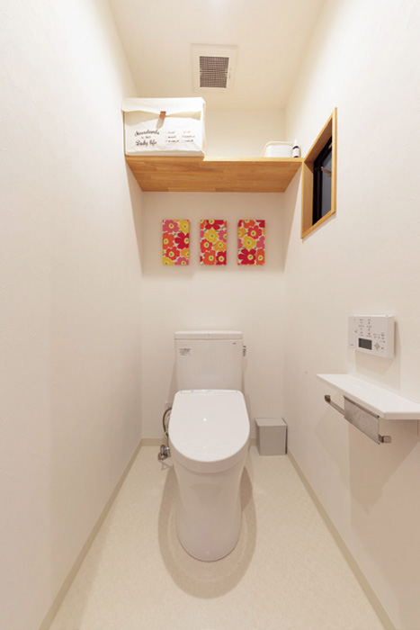 以前の広さを半分に減築したトイレルーム。固定棚を新設、クッションフロアと壁クロスで清潔感も演出。