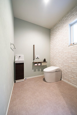 1階のトイレは車椅子でも使いやすく、ゆとりある広さ。タンクレスタイプの採用で省スペース化も図った。