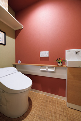 トイレの位置は変更せず設備を交換。床は和のテイストを感じさせるクッションフロア。クロスの色を張り分け個性的に 。