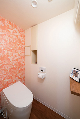 トイレは場所を変えず設備を交換し、斜めの位置に飾り棚を確保。アクセントクロスの壁で空間に変化を楽しむ演出も。