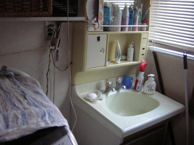 ![]() 施工前の洗面所は、鏡台部分も小さく蛇口が ふたつに分かれていました。 |