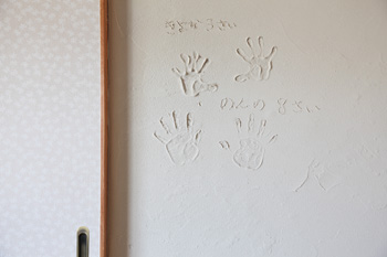 | リフォームの竣工を記念して、2階のリビングの壁に3歳の娘さんと、ご主人の妹さんの子どもの手形を残した。珪藻土ならではの面白いアイデアだ |