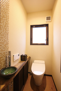 トイレ 壁に貼ったモザイクタイルがアクセントになっている |