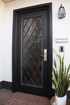 | 玄関 従来の玄関ドアに木目の化粧シートを貼っただけだが新品のように見える |