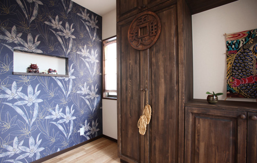 大胆な柄のクロスを貼ったホール。圧迫感を与えないよう中央にカウンターを設けた。「吾・唯・足・知」の壁掛けは知人からの手づくりプレゼント