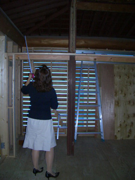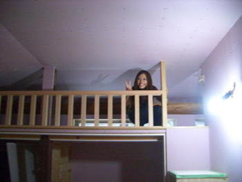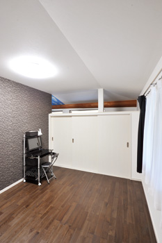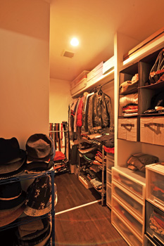| オシャレなご夫婦らしく、たくさんのワードローブが収納された広いウォークインクローゼット。アイテムごとに置き場所を決めて収めているため、整然として見える | 寝室の収納部屋の上は子ども部屋とつながるロフト。こちらの方角から少しでも採光できるよう、横長の窓を開口した |