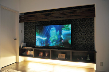 | 冬は寒さが体にこたえていた純和室から一年中快適な洋室LDKに大変身。くつろぎのソファは低めのものを選んでいるため、圧迫感も感じられない | リビングの電気をすべて消し、間接照明だけ灯して雰囲気を楽しみつつテレビや映画を観ることも多いという。「バーのような雰囲気ですが、お酒は飲めないんです」とご主人 |