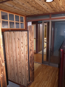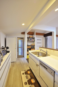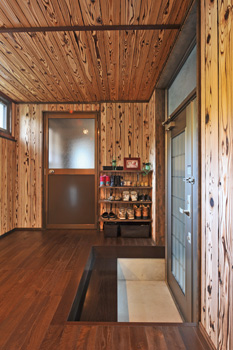 | 下駄箱を新しく造り付け、焼き杉で囲まれた玄関。奧のドアで母屋と繋がっている | 壁付きから対面式に変更し、家事動線もスムーズになったキッチン。天井高を考え、上部分にはあえて収納スペースを設けなかった |