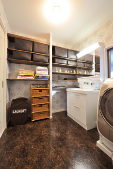 | 壁のほぼ全面に収納カゴや棚を配し、多くのモノをすっきり収納できるようにした洗面・脱衣室。ここのクロスも素敵 | 青空の天井クロスやピンクのカーテンなどでポップにまとめられた子ども部屋。階段代わりの収納ボックスを上ると、寝室ともつながるロフトスペースが |