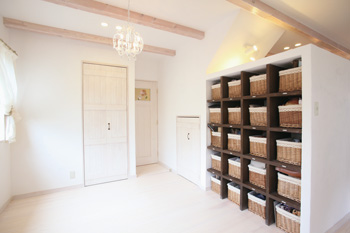 | トイレも玄関と同じテイストで統一。ビーズ照明はご夫妻の合作 | アトリエに造り付けられた収納棚には奥さまの作業道具が |