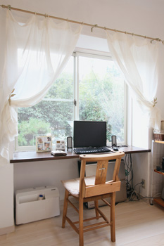 | アトリエの明るい窓際はご夫妻の作業スペース | 浴室は以前の住人がリフォーム済みだったため、蛇口とシャワーをドイツのハンスグローエ社製に取り替えた |