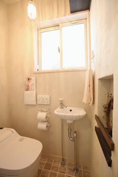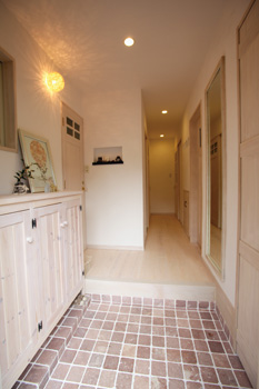 一貫したイメージで上質ナチュラルを実現完成した広大なLDKは、理封藻土入り漆喰で塗られた壁と、パイン材に白い塗装を施した床が明るさを増し、開放感を演出。随所に設けられたニッチは、プランニングの段階で置く物をあらかじめイメージしてから作り、飾られた雑貨のセレクトも秀逸。細かいディテールにまで奥さまのセンスが反映されていて、思わずため息が出るほどだ。思い描いた通りの空間を実現するため、持っていた冷蔵車に白いシートを自分で貼って空間になじむようにするなど、徹底したこだわりがこの見事な空間を作り出したともいえる。 キッチン横には和室があり、押し入れの複葉には輸入物の壁紙が貼られ、スタイリッシュ感を演出。コーディネーターも「苦労してサンプルを取り寄せた甲斐があった」というほど、この空間を上質なものに高めている。 玄関やトイレにあしらわれたレンガ風のタイルの目地は、クッションフロアよりも高価だったが、奥さまは「石のタイルにすることでることで年を経ても汚れが味になるだろう」と多くのサンプルを吟味した上で煉瓦風のタイルをセレクト。 他にも、自らデザインしたステンドグラスをはめこんだドア、家具屋に雑誌を見せて作ってもらった靴箱など、一貫した奥さまのイメージがこの見事な空間の完成へと導いた。 |