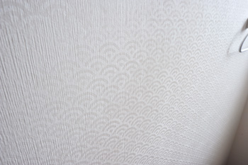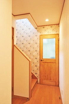 | 階段の壁には、本誌で見た柄が気に入った壁紙を貼っている | 縁起の良いうろこ柄の壁紙を貼り、アクセントを加えたトイレ |