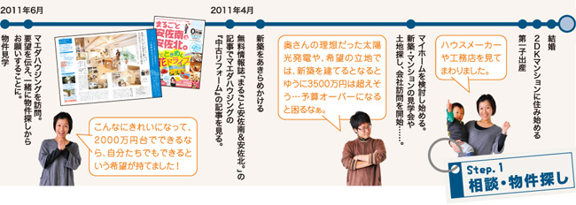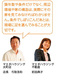 そんな時、「まるごと安佐南&安佐北。」を通じて知ったマエダハウジングを訪ね、本誌掲載の中古リフォームが予算的に無理のない範囲で可能なことを知ったEさん。スタッフ同行で、中古物件を見て回ることにした。