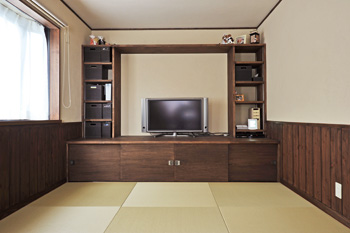 | いよいよリフォームプランに取りかかったEさん夫婦。 物件が築9年と比較的新しく、耐震基準もクリア済み。クロスの張り替えなどは、入居前にあらかじめ不動産会社が新しいものにしてくれていたこともあり、太陽光発電やご主人が望んでいたウッドデッキ以外は、生活のメインスペースである1階屋内を重視したリフォームを行うことにした。 LDKは、半分のスペースを畳敷きにし、家族でくつろげる空間に。玄関側には、布団が収まるほど奥行きのある膝高の収納スペースを確保。壁は全面的に自然素材の珪藻土を自らの手で塗ることに。 内装は、お二人とも和装関連の仕事を手がけていたこともあり、全体的に控えめな色合いにまとめ、落ち着きのある空間をイメージ。階段やトイレには、こだわりの壁クロスをセレクト。 最後に、「将来的にはあった方が便利」というご両親のアドバイスで、2階にもトイレを新設することを決めた。 |