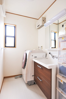 | Eさん夫婦らしい、和風を感じさせるうろこ柄の壁紙 | 新しい洗面台と大きな洗濯機を据えた洗面所 |