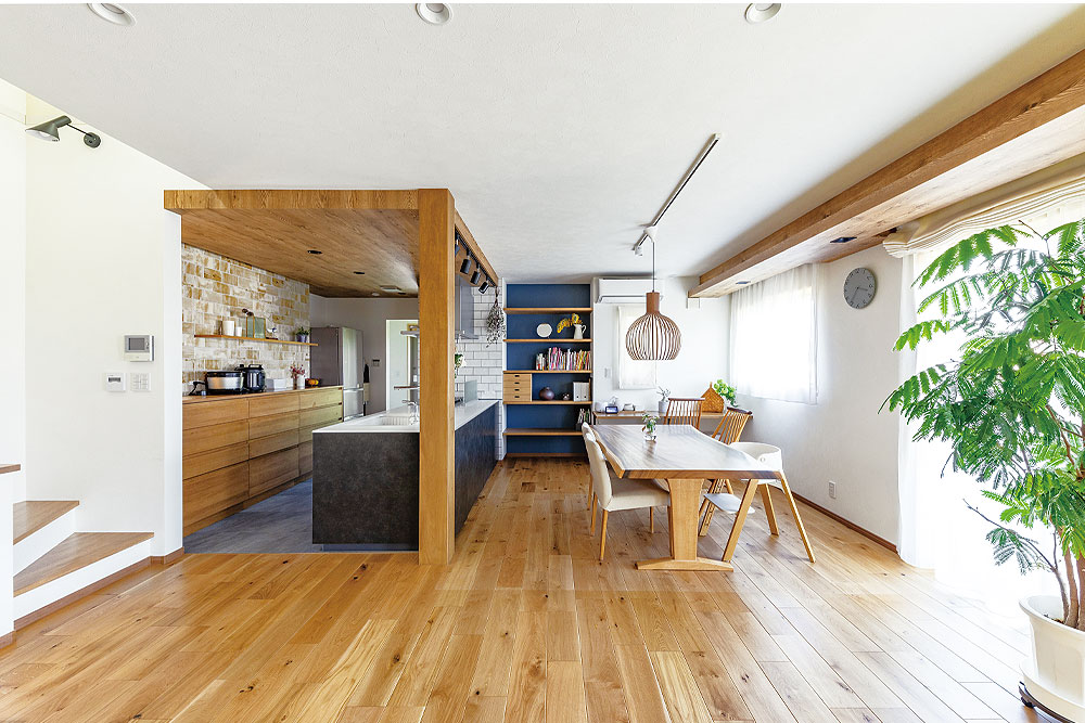 ゆったりとしたリビングは生かしながら、リビング階段を掛け替えてキッチンをより広く。つり戸棚は外して、1日の中で長時間を過ごすキッチンからリビングにいる家族や窓の外の緑を見渡せるようにした。壁紙は部分的に柄入りクロスを取り入れて、自分たちの好みを反映させている。「あの時あきらめないでマエダハウジングさんにお願いして本当に良かったです」と奥様。「全て自分たちで決められたので、後悔のない家づくりができました」と晴れやかな笑顔で話してくれた。
