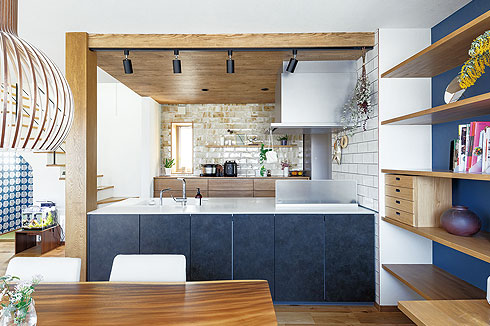 キッチンは木目調の下がり天井でナチュラル感を演出。つり戸棚を外したことでキッチンに立ったときの視界が開け、閉塞的だったキッチンにリビングダイニングとの一体感が生まれた。リビング側に収納があるキッチンはグレーがかった黒を選ぶことで空間を引き締めている