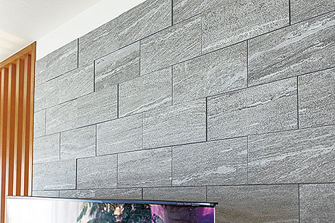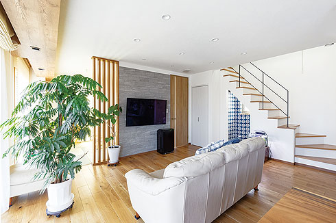壁掛けテレビの背後はA様が友人と一緒にDIYで取り付けたエコカラット。格子の向こうにはご主人が希望した日当たりの良い畳コーナーがあり、お子さんの遊び場にもなっている