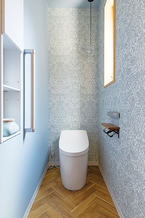 トイレの収納棚は既存のまま残し、ヘリンボーン柄のフロアと淡い色で花と鳥の描かれたクロスを張った。ペーパーホルダーも木目調のものに変更して統一感をもたせている