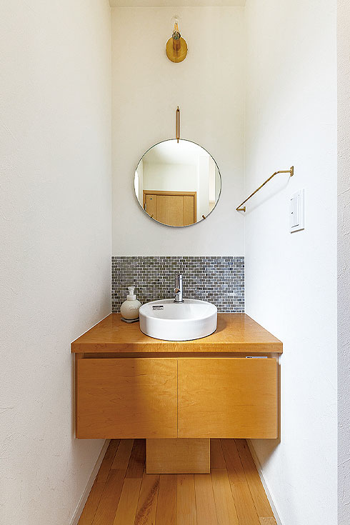 1階の玄関ホールにある洗面台はそのまま生かし、鏡を丸型に変えて壁の立ち上がりにタイルをあしらった。照明やタオル掛けはクラシックな雰囲気を演出する真鍮を選択。モデルルームを見るのが好きだという奥様がインターネットで好みの住宅の写真を探し、コーディネーターと共有して細部まで理想を実現した