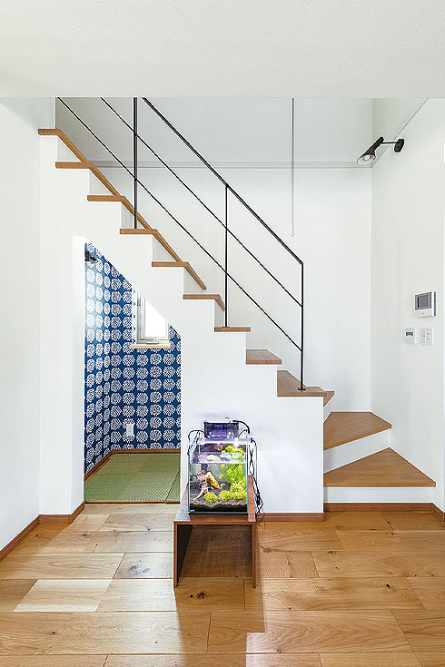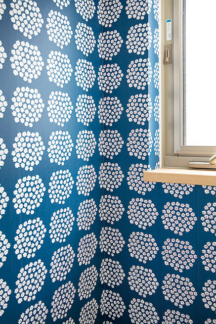 リビング階段下の空間を生かして、おこもりスペースを用意。くつろげるように置き畳を敷いた。マリメッコの華やかな壁紙が全体のアクセントとなっている