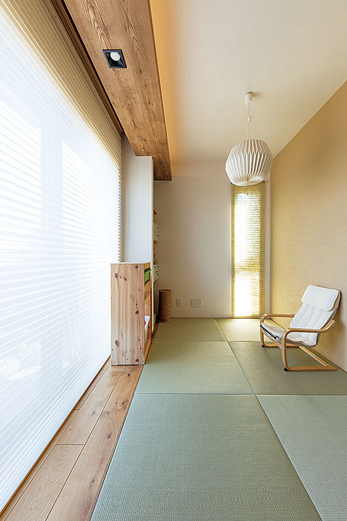 リビングに隣接するフリースペースを家族がくつろげる畳コーナーに