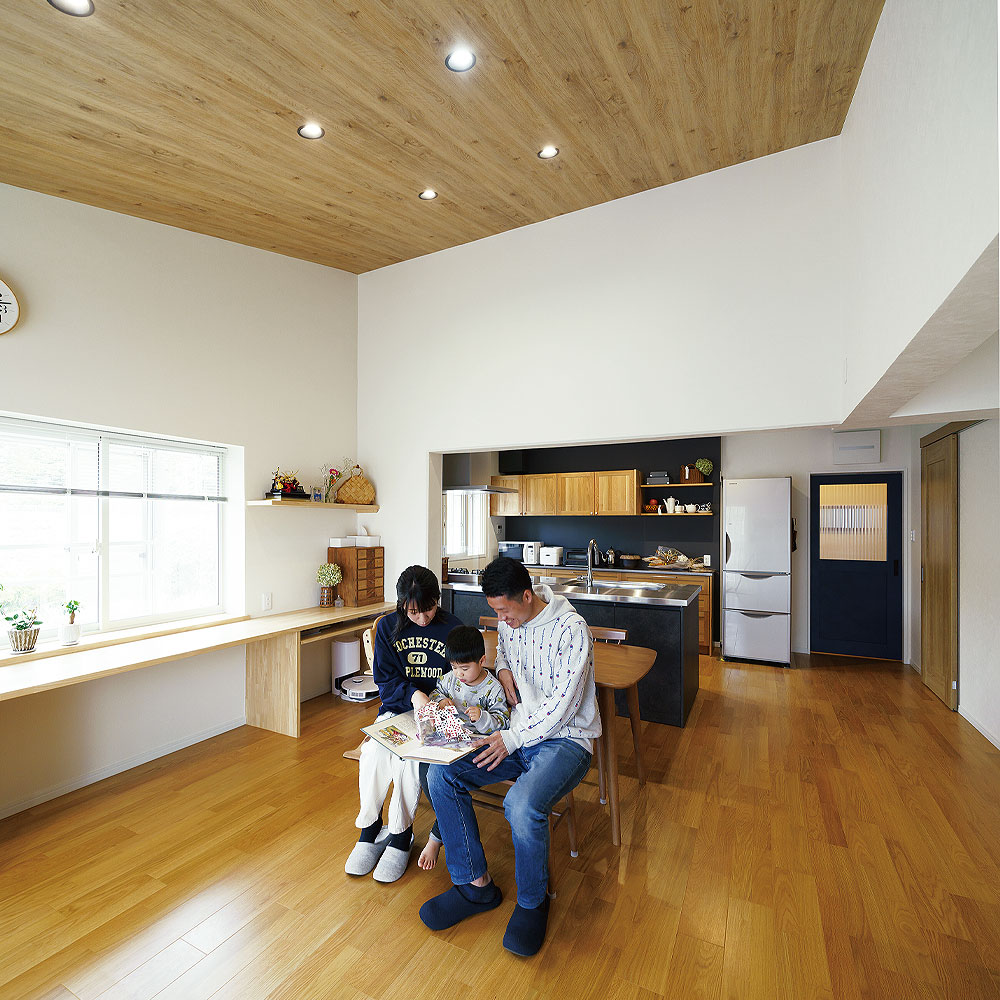 開放感を生む勾配天井に木目調クロスを張り、床には無垢材の風合いを持ちながら反りなどの不具合が少ない高品質のフローリングを採用したLDK