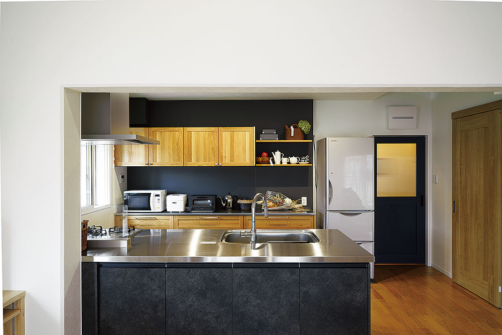 キッチンはステンレス天板とブラックの側面の対比が美しいクリナップ製。黒のアクセントクロスを採用した壁とウッドワンのカップボードとのコントラストが印象的