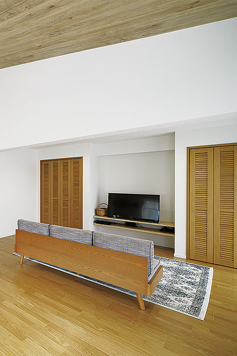 ウッドワン製ルーバー扉に憧れていた奥様は、この扉を目立つ場所に使いたいと造作テレビ台の両側に新設した収納スペースに採用。中には主に洋服を収納している