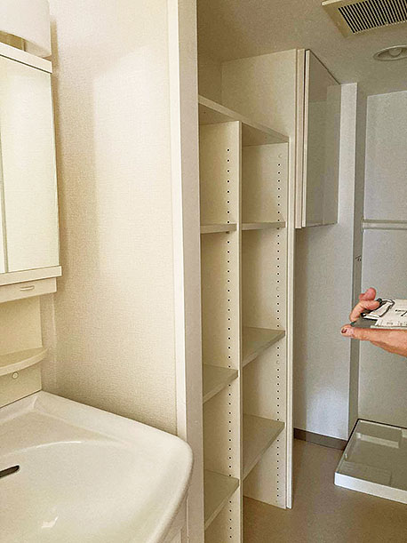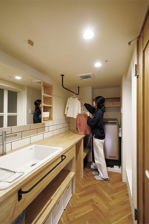 洗面室は収納棚と衝立壁を撤去し、横長のカウンターにシンクを埋め込んで造作洗面台を新設。雨天時は室内干しができるよう天井にホスクリーンを設置し、壁にタイル、床にヘリンボーン張りに見えるクッションフロアを採用