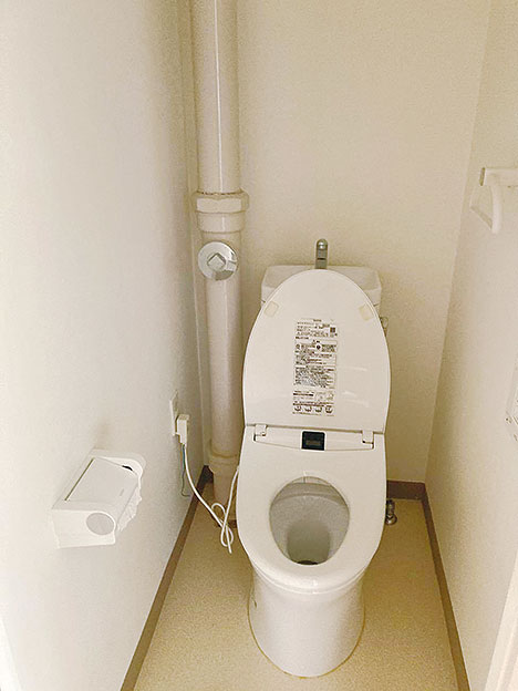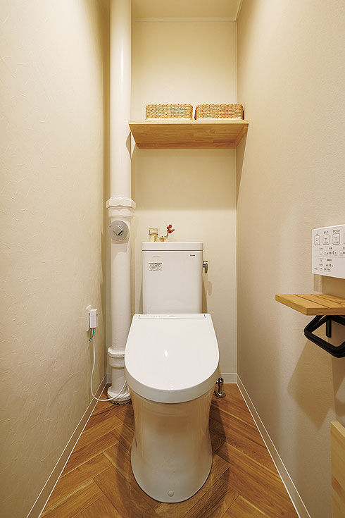 設備を一新したトイレ。造作棚を新設し、木製ペーパーホルダーを取り付けた。床のクッションフロアは洗面室と同じものを採用して統一感を生んでいる