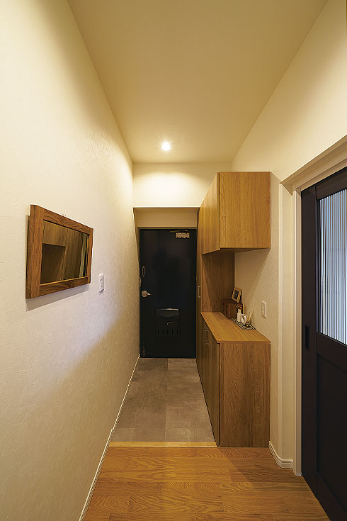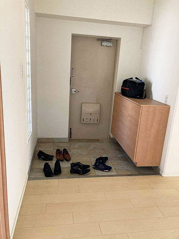 下足箱を撤去して新しく設けた玄関収納で、玄関の収納力が大きく向上した。玄関ドアは内側のみ色を変えて塗装し、雰囲気も一変