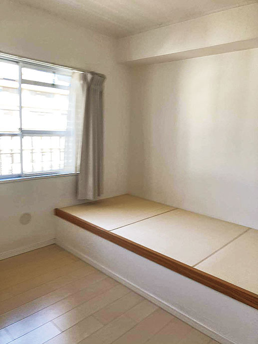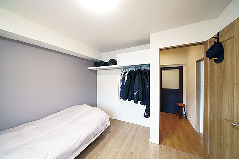 もともと5帖だった寝室は、小上がりの畳コーナーをなくして5.2帖に。玄関方向に広さを増した部分には扉のない収納スペースを確保した