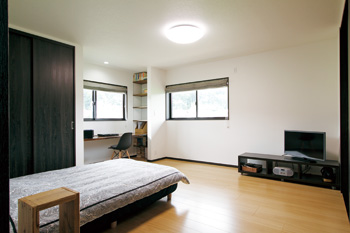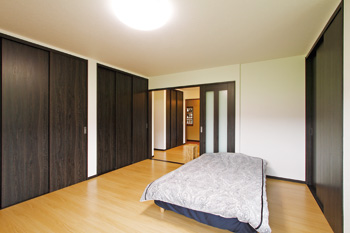 | 縁側だった場所には、収納スペースと書斎カウンターを設置。構造上必要な壁との間には棚を造り付け、空間を有効活用。床の間を撤去して窓を開口したことで、さらなる明るさも取り込めるようになった | お父様の寝室。押し入れが天井までの高さの大容量収納スペースになり、3枚扉の引き戸でより便利になった |