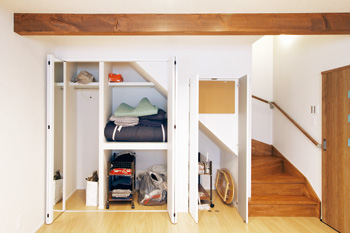 | 階段下を最大限活用した収納スペース。空間を仕切る工夫も凝らされている | 収納の折れ戸の1枚には姿見を貼っているため、身支度を整えるのにとても便利。急だった階段は、勾配を緩やかにして架け替えた |