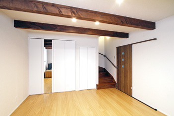 母屋は2室の和室を洋室と廊下に変更。蔵は強度を増し、1階と2階に洋室を配置し、2階にはウォークインクロゼットも確保。外壁は、母屋は漆喰とスギ板、蔵はサイディングを採用。土台は母屋も蔵も新しく造り替えて安全性を増した。屋根は母屋の瓦に合わせて新しく葺き替え、蔵の屋根には補強を施した。