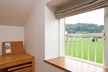 | 屋根の補強のために天井が幾分低くなったが、同時に落ち着きも感じられる空間に。 | 調湿性に優れている蔵の壁はもともと約30㎝と厚いため、出窓のような形に。窓の外にはのどかな田園風景が広がり、心癒やされる |