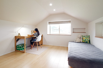 | 和室は勝手口を設けた廊下に変更。お父様の寝室との間を仕切るドアは引き込み戸に | 勾配天井になっているため、視覚的にはそれほど低さを感じない。好きな雑貨を飾るためのニッチもしっかり造作 |