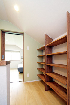| 階段を上がったところにある可動棚。大容量の書庫や収納スペースとして使える | 2階の部屋からつながるウォークインクロゼット。奥行きがあり、壁には大きな姿見も |